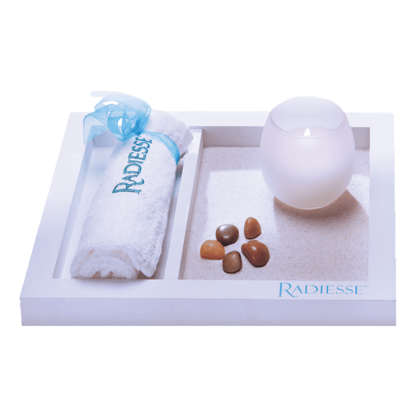 Incluye: 1 toalla de manos, 2 toallas faciales, 2 velas, arena y piedra