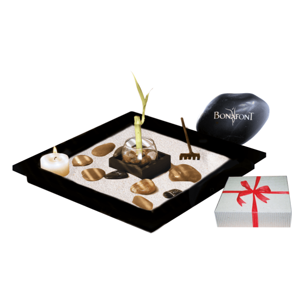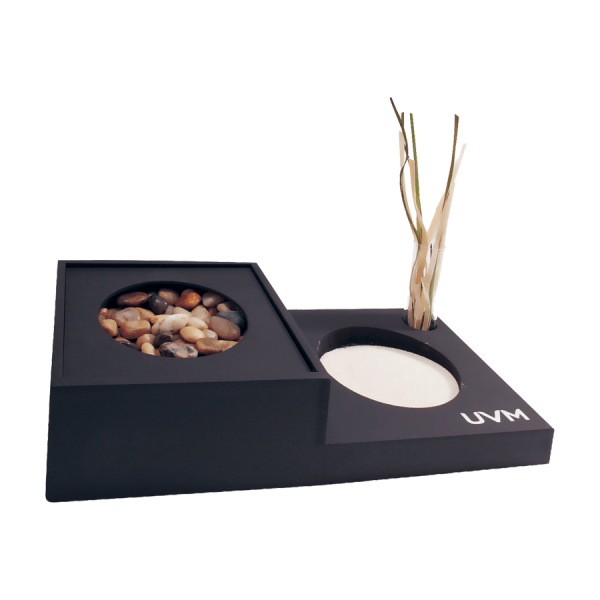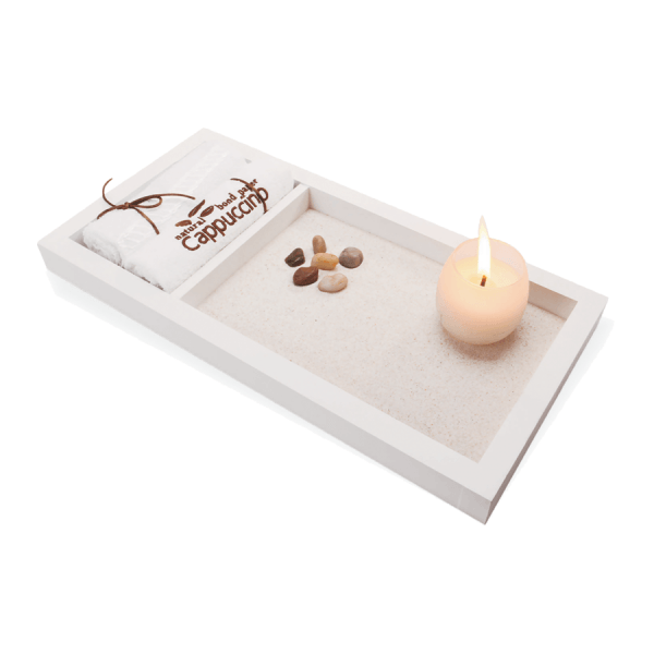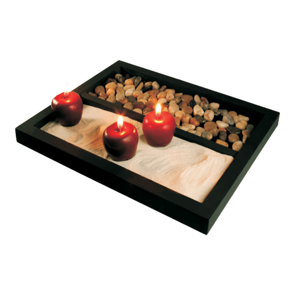 Jardín con base de madera 20 x 15 cm Incluye: 1 toalla facial, 1 vela, arena y piedras